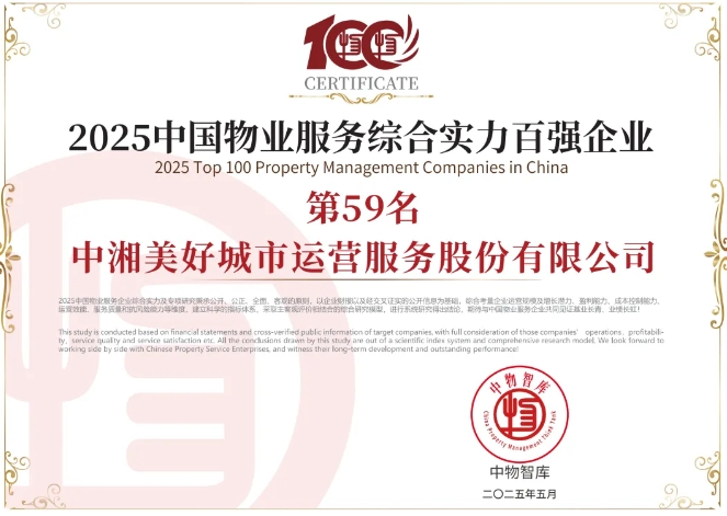 • 載譽篤行 | 中湘美好榮登“2025中國物業(yè)服務(wù)綜合實力百強企業(yè)、國有企業(yè)百強、品牌影響力百強企業(yè)”榜單